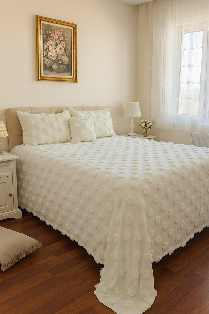 ponpon pastel desenlere sahip ekru yatak örtüsü, yatak odanıza yumuşak dokulu bir görünüm kazandırır. Uyuyan kılıfları ile birlikte gelir. ️260×260 ölçülerinde süs yastığı hediye