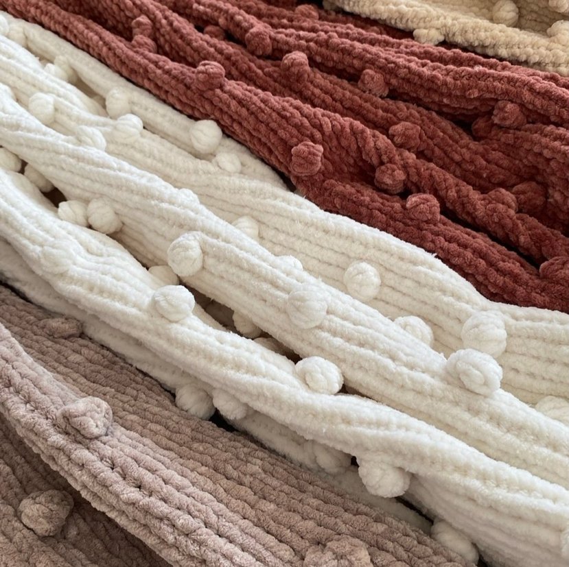 Ponponlara sahip renkli yumuşak örgü çocuk battaniyesi, rahatlık sağlar. Kadife iptir istenilen renkte örülür