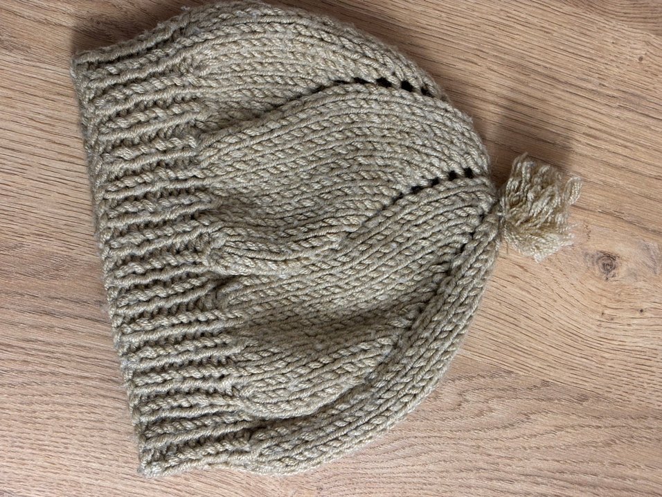 Bej renkli, örgü dokulu kadın bere, rahat ve bohem tarzı yansıtan sıcak bir tasarıma sahiptir. El yapımıdır