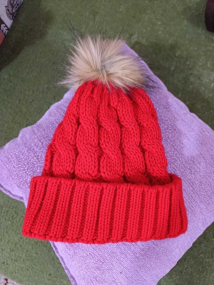 Renkli kırmızı örgü kadın bere, yumuşak dokusu ve üstündeki suni kürk ponponuyla bohem ve retro tarzı yansıtıyor. Hiç giyilmedi