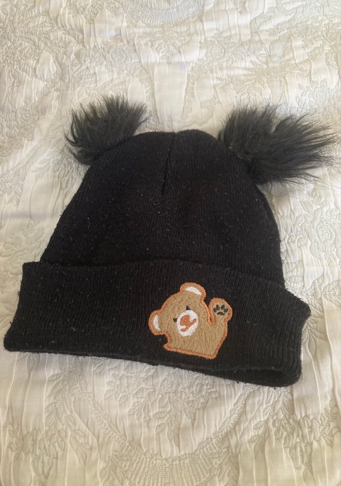 Koyu kahverengi, yumuşak ve sıcak kumaştan çocuk bere. Üstünde kürk detayları ve nakışlı ayı figürü bulunur. Trendy günlük stil için uygundur.
