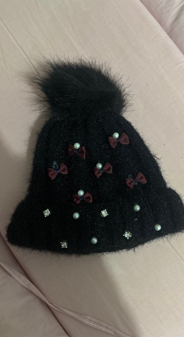 Küçük fiyonklar ve inci detaylarıyla süslenmiş, kürk ponponlu siyah örgü bere. Bohem tarz için sıcak ve şık bir seçim. ❄️