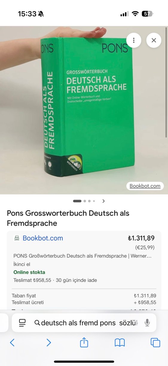Pons sözlüğü, Almanca yabancı dil için kapsamlı içerik sunar; çevrimiçi kelime hazinesi ve fiil çekim araçları içerir. Piyasa fiyatı 1500 tl