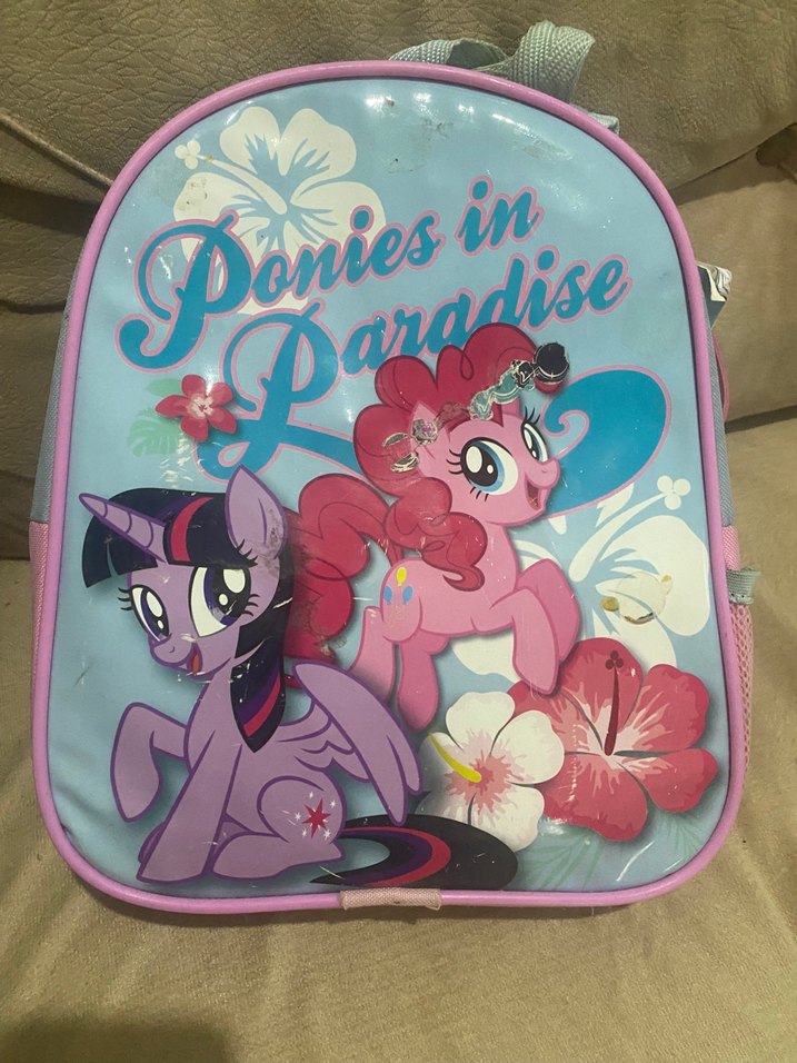 Pembe pastel renkte çocuk sırt çantası, 'Ponies in Paradise' yazısı ve pony karakterleri ile çiçek desenleri içerir. Çanta sorunsuz