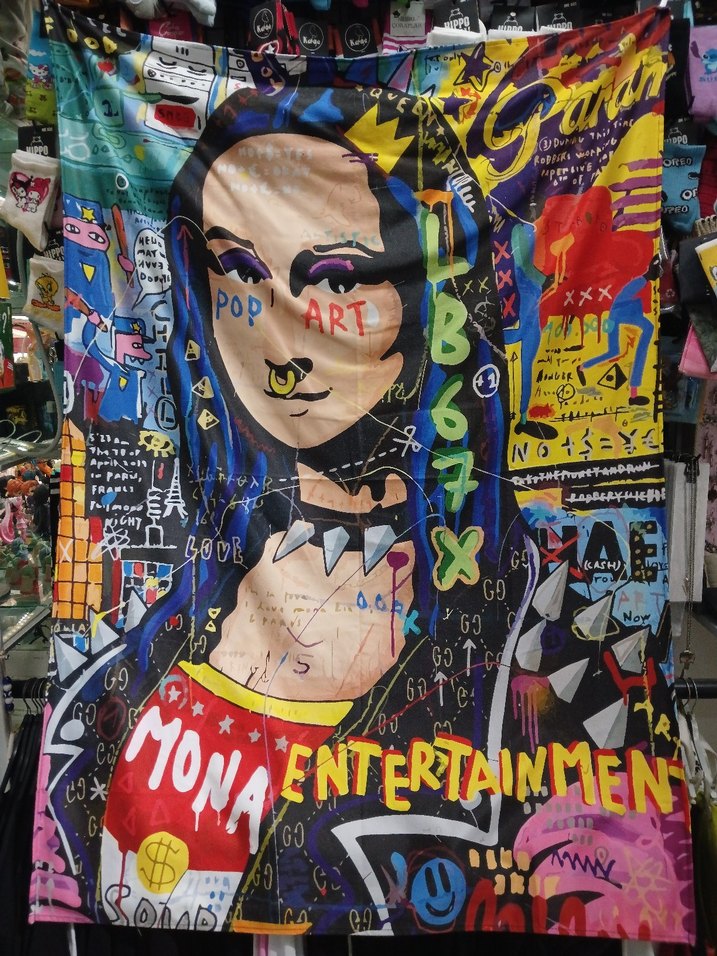 Pop art tarzında, Mona Lisa'yı modern eğlence unsurları ve renkli soyut tasarımlarla yorumlayan Duvar Halısı 100x150 cm ebatlarında