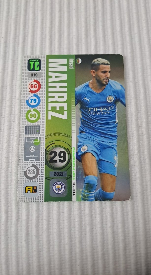 Açık gri renkte, Riyad Mahrez'in 2021 Manchester City forması ve istatistikleriyle pop kültür temalı erkek rozeti. Trendy casual athleisure tarzına uygun. ⚽