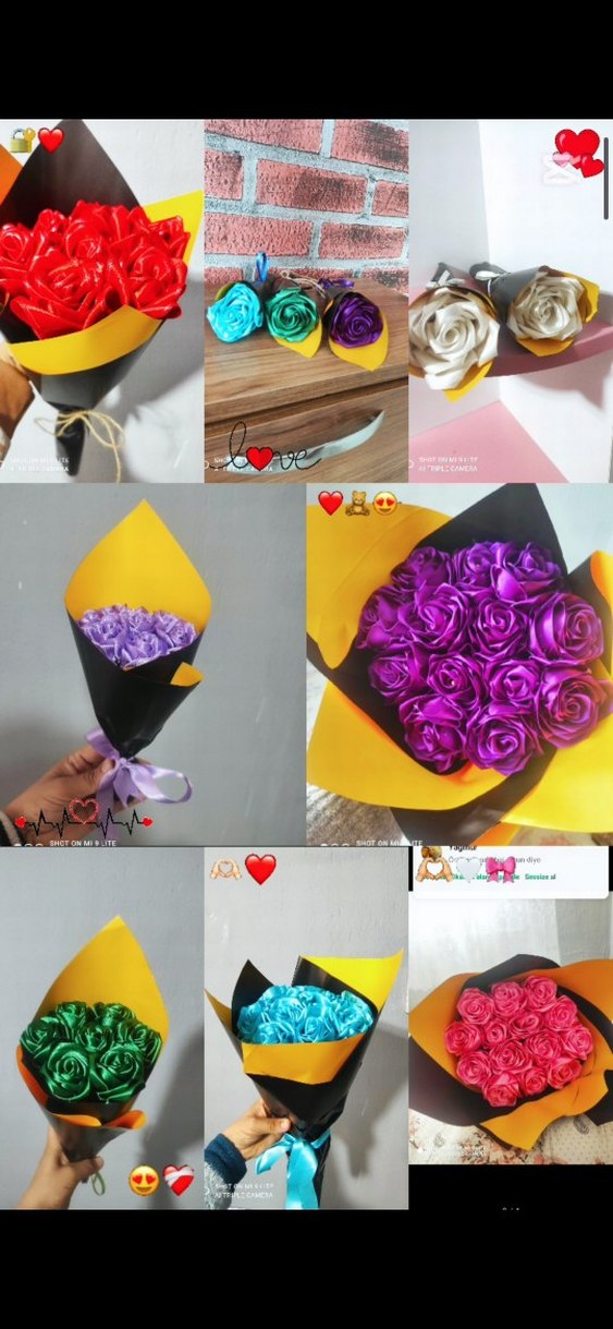 Sarı ve siyah kağıda sarılı, uyumlu kurdeleli renkli gül buketleri, pop kültür temalı. Kırmızı, yeşil, mor ve mavi seçenekleriyle.