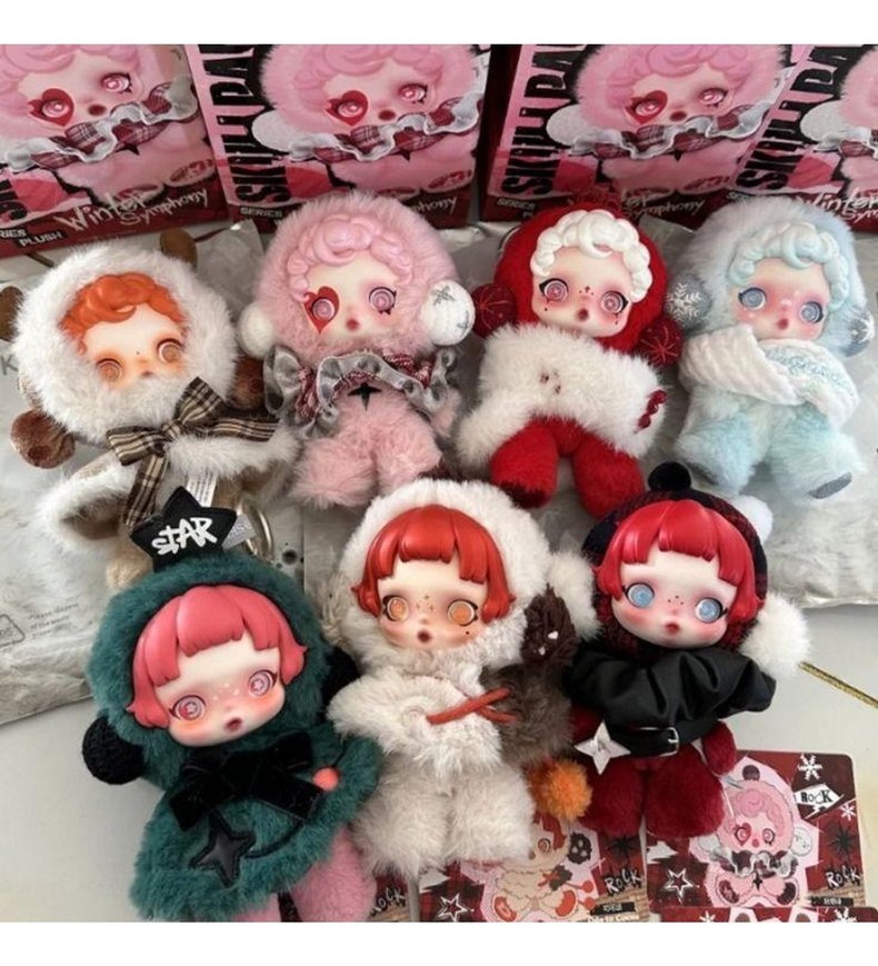 Canlı koyu renklerde çok renkli peluş oyuncak koleksiyonu. Her oyuncak farklı kıyafet ve detaylı yüz ifadelerine sahip. "StARZ" yazısı bir şapka üzerinde bulunur.