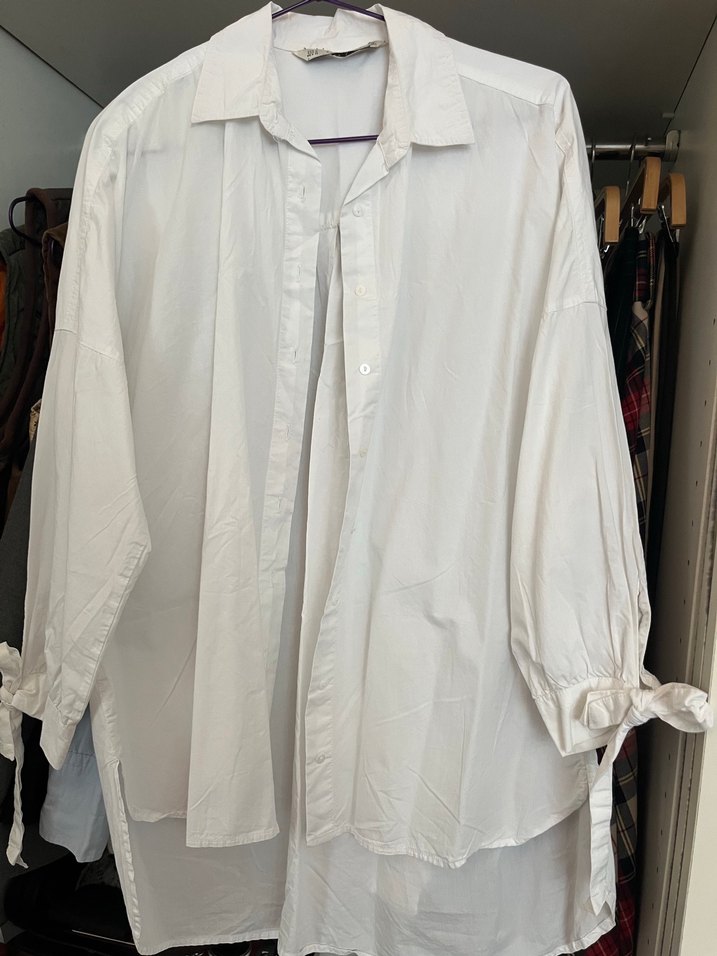 Kolları bağcıklı, düğmeli, bol kesin beyaz poplin gömlek. Bir sorunu yoktur. Markası zara