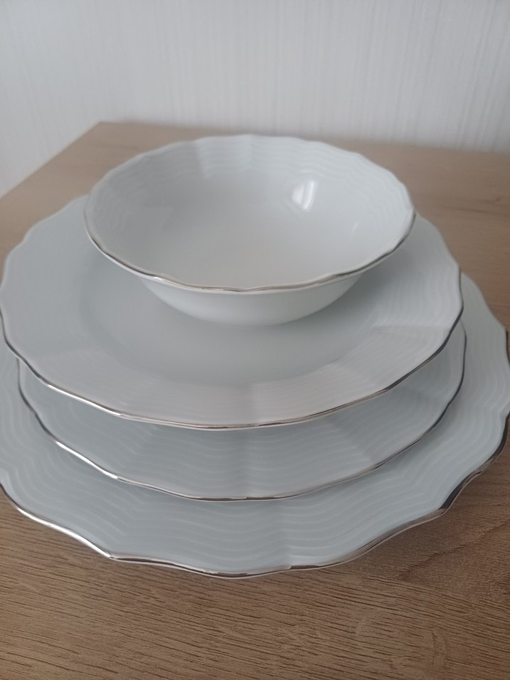 platin file kenarlı beyaz yemek takımı kenarlarında hafif dalgalı desen bulunur. ️60 parçadır diğer takımlardan farkı 12 adet tatlı tabağı vardır
