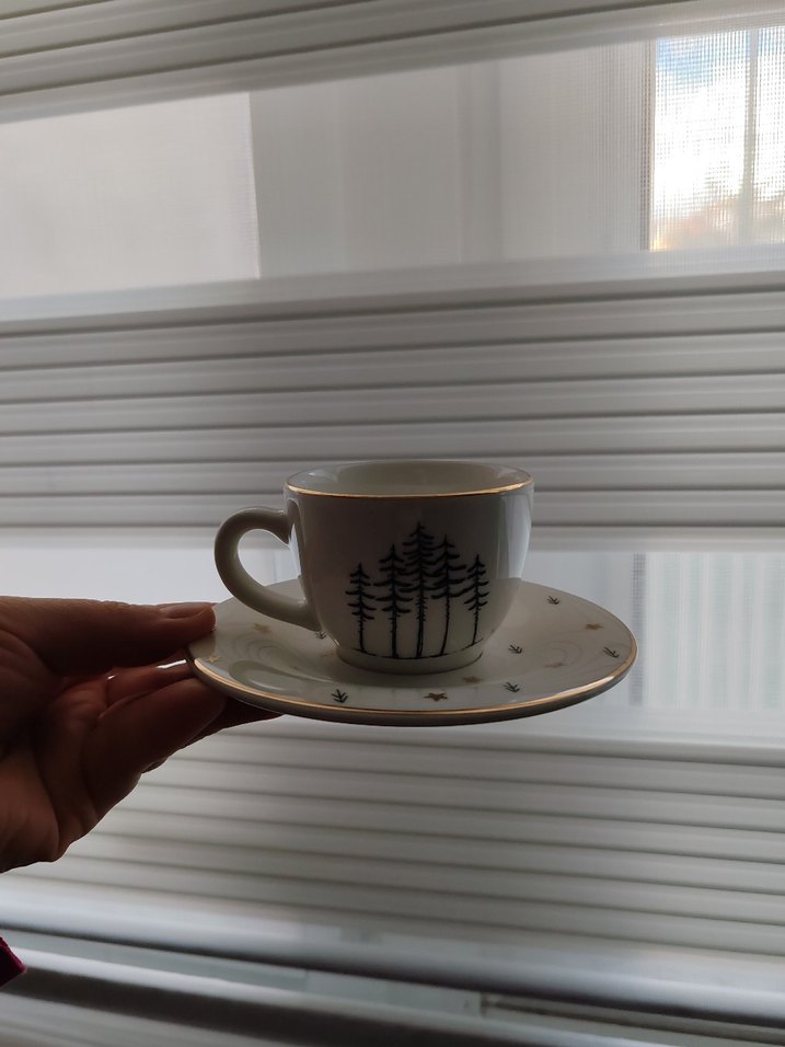 Gri ağaç desenli, küçük süslemelerle beyaz fincan ve tabak seti, kahve servisi için uygundur. ☕ Bir tanesi kırılmıştı yapıştırdım öyle kullanıyorum bir tanesinin de kulp kısmında hafif çatlama var kullanıma engel değil