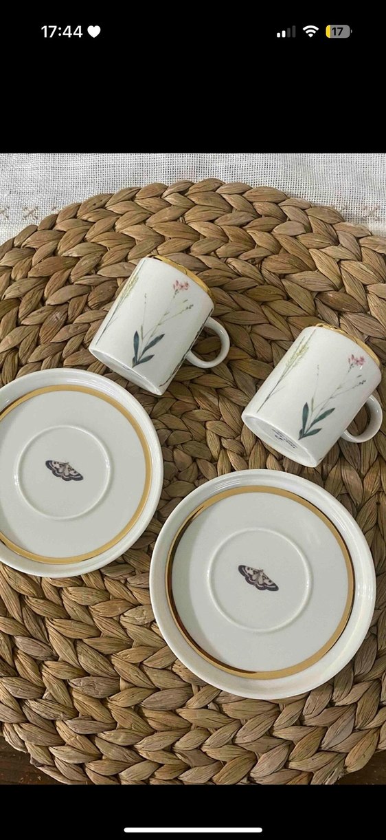 Altında kelebek figürü ve ince altın çizgiler bulunan beyaz çiçek desenli fincan ve tabak seti. ☕