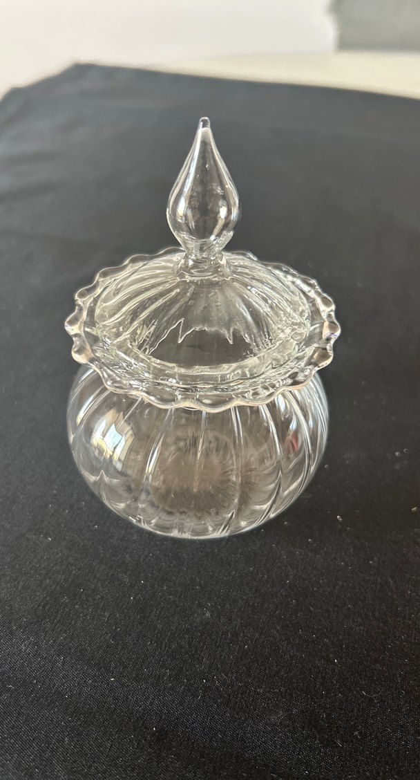 Parlak beyaz camdan yapılmış, dekoratif kapaklı ve yuvarlak gövdeli klasik ve şık bir lokumluk.