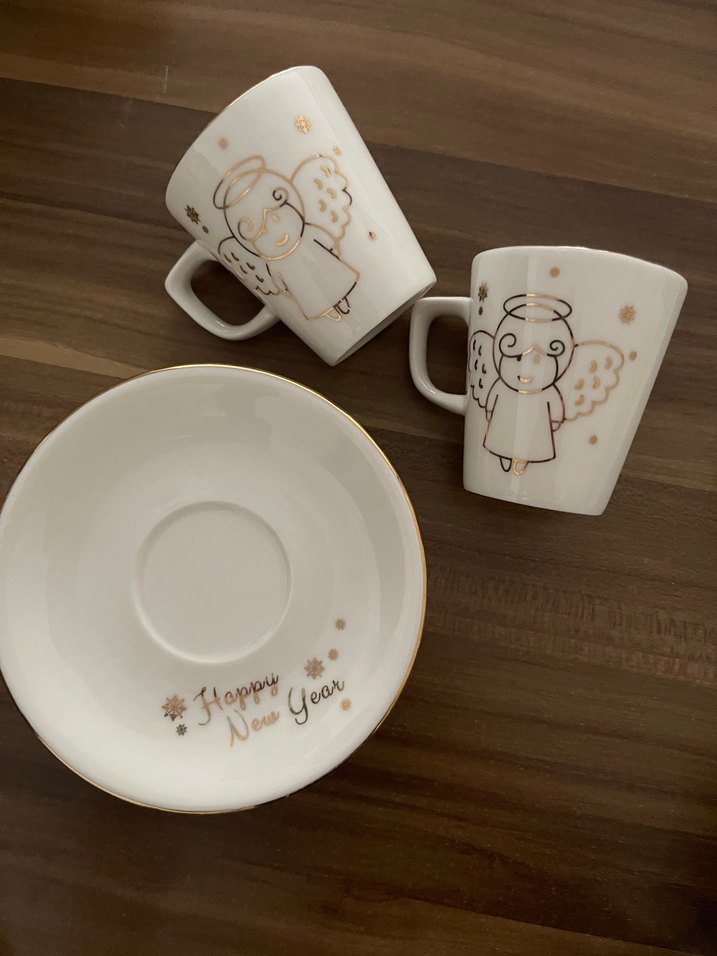 İkili 800TL Beyaz renkte melek desenli iki fincan ve "Happy New Year" yazılı tabaktan oluşan set. ☕
