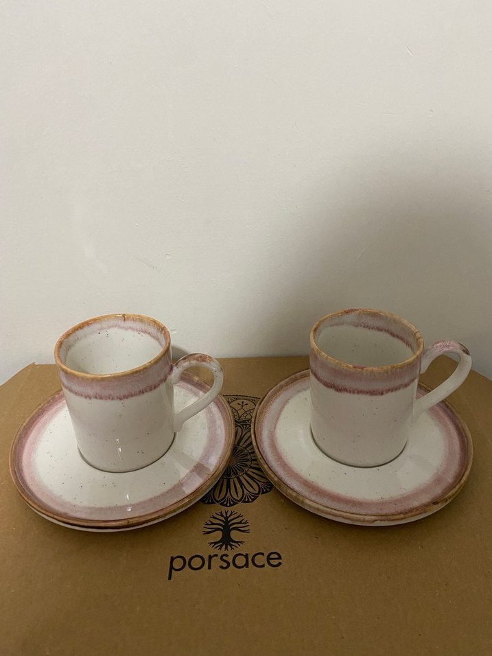 Porsace markasının pembe pastel renkte, yumuşak renk geçişli iki kahve fincanı ve tabak seti. Her fincanda rahat tutuşlu kulp ve ince renk detayı bulunur. ☕