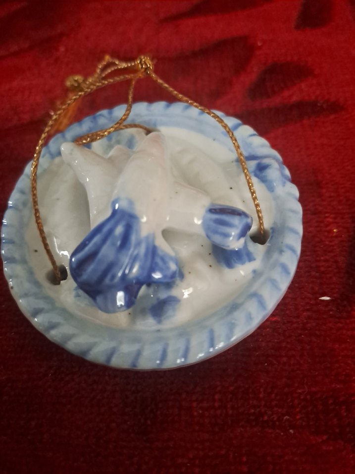 Hafif mavi ve beyaz renklerde, balık figürlü seramik figürin. Asma ipi ve parlak yüzeye sahiptir.