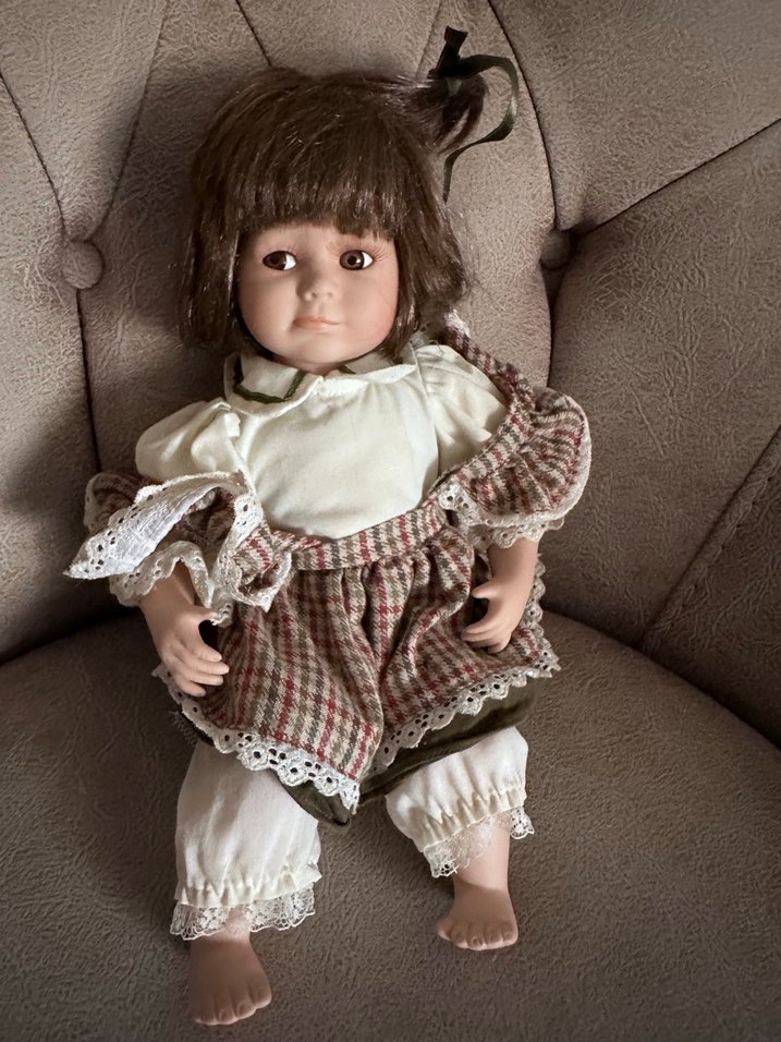 Kahverengi saçlı oyuncak bebek, dantel detaylı vintage tarzı kıyafet giymiştir. Yumuşak kumaş gövdesi ve klasik yüz ifadesi vardır.