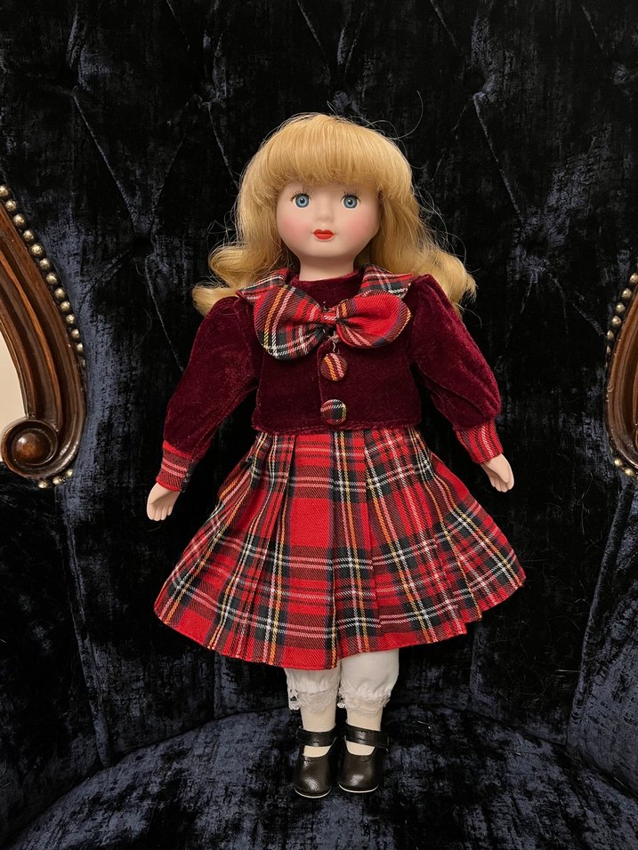 Klasik bebek, koyu bordo kadife üst ve kırmızı ekose etek ile birlikte geliyor. Sarı saçlı ve siyah ayakkabılı.