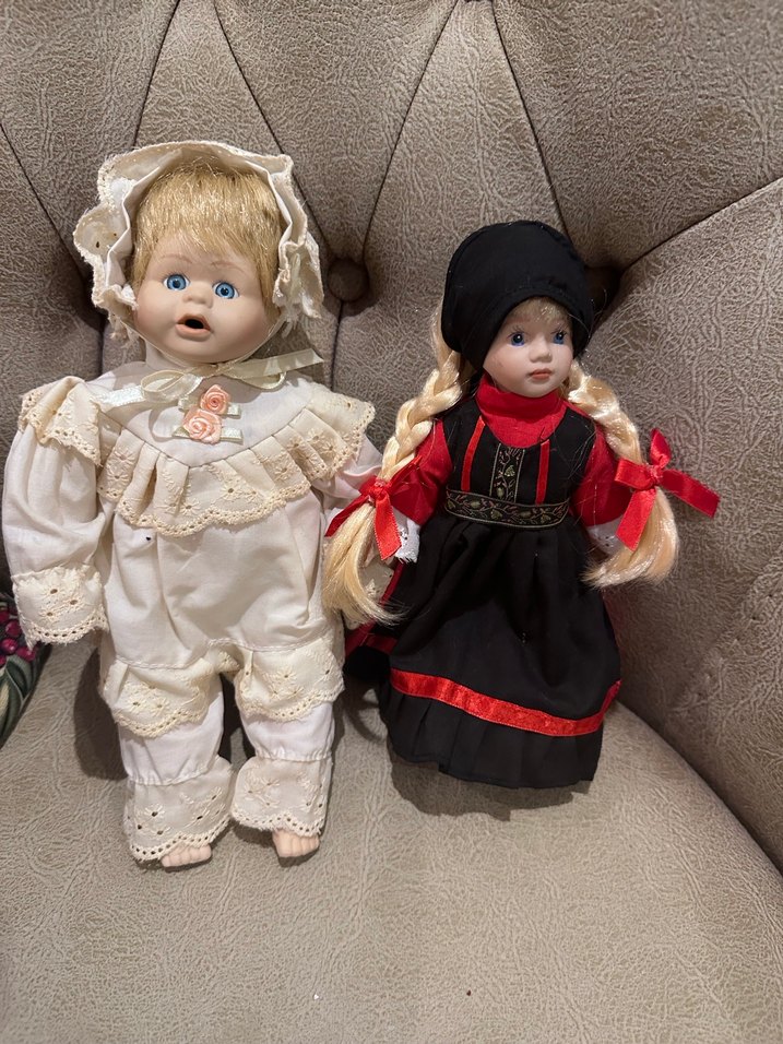Dantel detaylı beyaz kıyafetli ve siyah-kırmızı elbiseli örgülü saçlı iki bebek. Yumuşak kumaş ve detaylı yüz ifadeleri içerir.