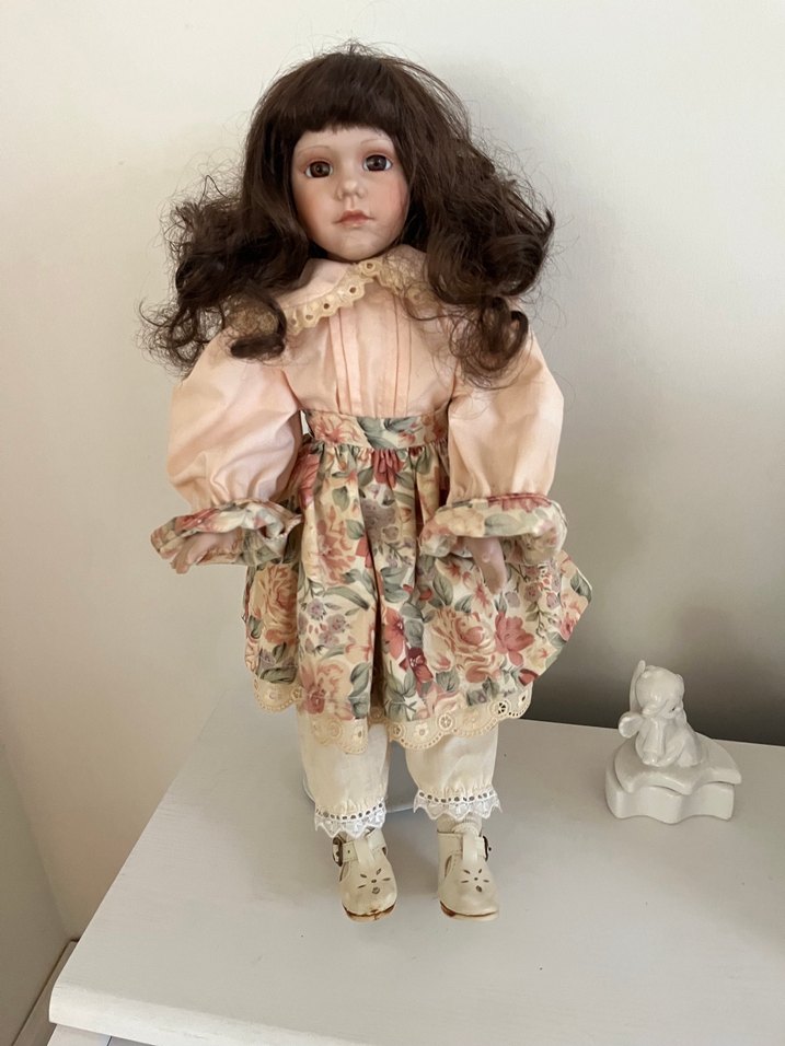 Kıvırcık kahverengi saçlı, pastel renkte porselen bebek. Çiçek desenli etek ve yumuşak pembe bluz giymiştir. Kırık atık yok stand dahil