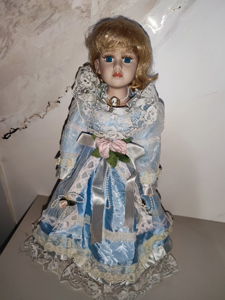 Mavi dantel detaylı elbise, saten kurdele ve çiçek süslemeleriyle pastel renkli bebek. Sarı saçlı ve zarif yüz hatlarına sahip.