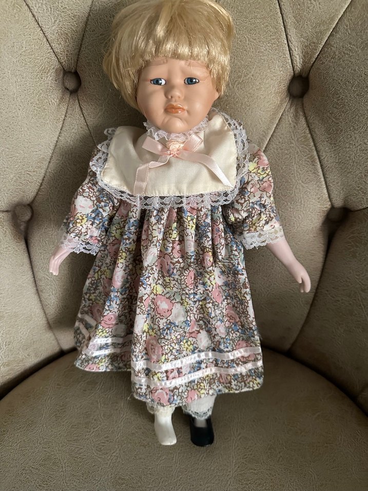 Bej renkli bebek, dantel detaylı pastel çiçekli elbise ve kurdele fiyonk taşır. Kısa sarı saçları ve gerçekçi yüz ifadeleri vardır.
