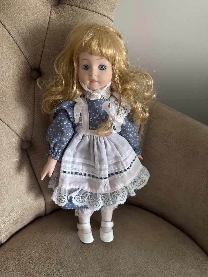 Blonde uzun saçlı bebek, pastel mavi elbise ve dantelli beyaz önlük giyiyor. Mavi gözleri ve beyaz ayakkabıları var.