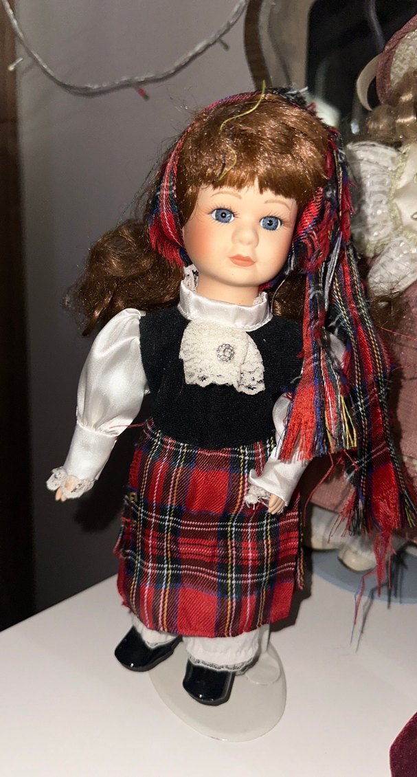 Koyu kahverengi saçlı, mavi gözlü bebek; çok renkli kareli etek ve başörtüsü ile beyaz dantel detaylı bluz giymektedir.İngiltereden alındı