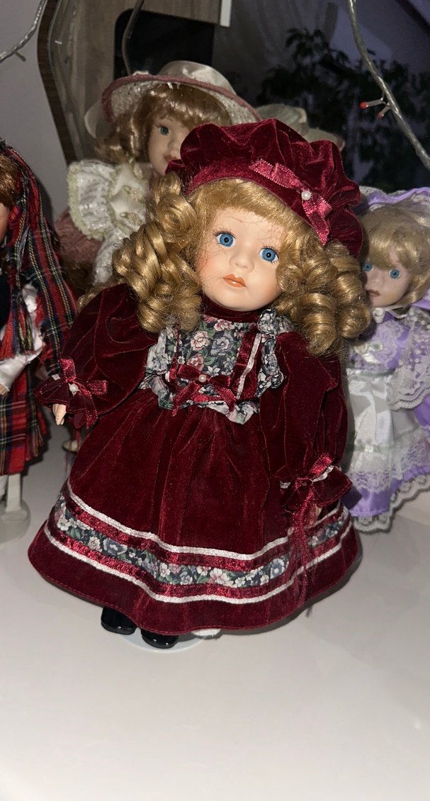 Koyu bordo kadife elbise, çiçek ve dantel detaylı, kıvırcık sarı saçlı ve mavi gözlü klasik bebek. Kadife şapka küçük fiyonk ve incili detay içerir. İngiltereden geldi