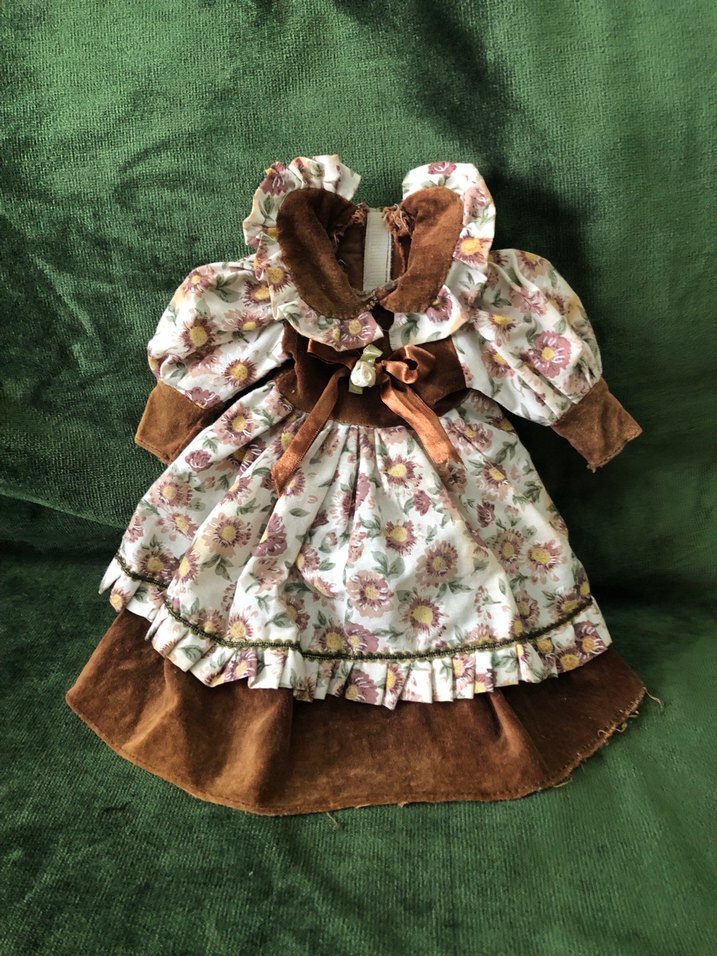 Porselen Bebek Elbisesi,yakalı ve fırfırlı elbise,Nakışlı pastel çiçek desenleri ve kahverengi tekstil kumaş, bohem tarzda. Askılı kollu ve şık bir model.
