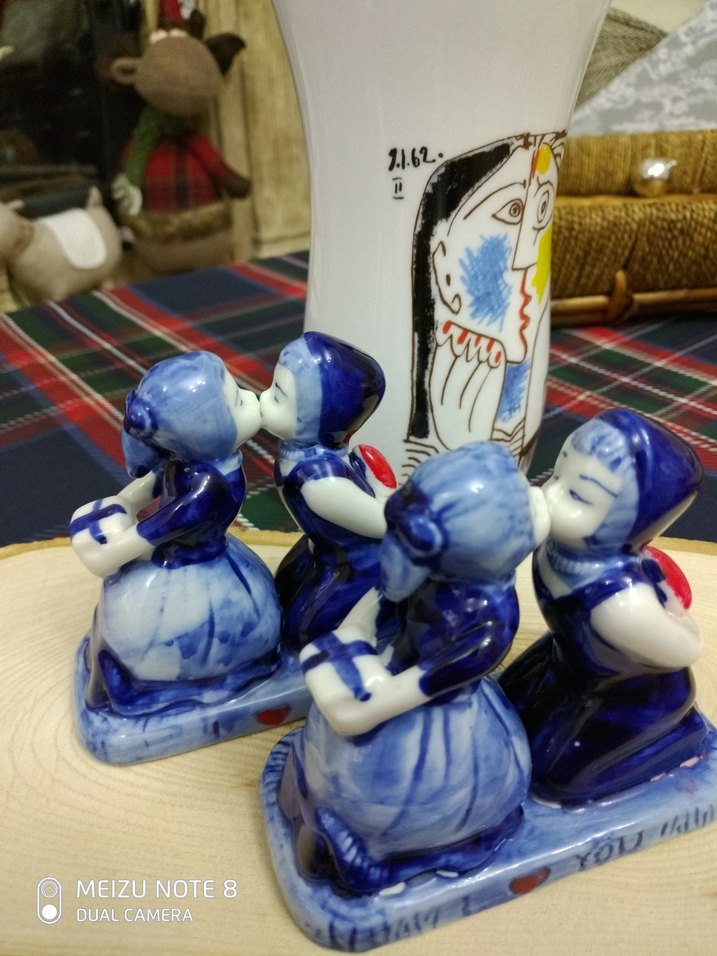 Renkli mavi seramikten yapılmış, öpüşen çiftleri temsil eden detaylı figürinler. Parlak bir kaplamaya sahip şık tasarım.