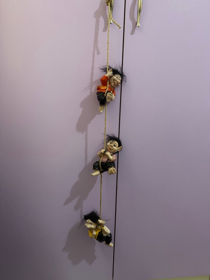 Üç adet ip üzerinde asılı, renkli kıyafetlere ve ifadeli yüzlere sahip koyu renkli cüce figürleri