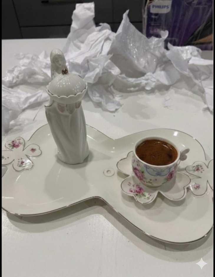 Detay almak ıcın yazınPorselenden yapılmış, kız figürlü dekoratif kahve fincan setidir. Çiçek desenli dört fincan ve özel tasarım bir tepsi içerir. ☕