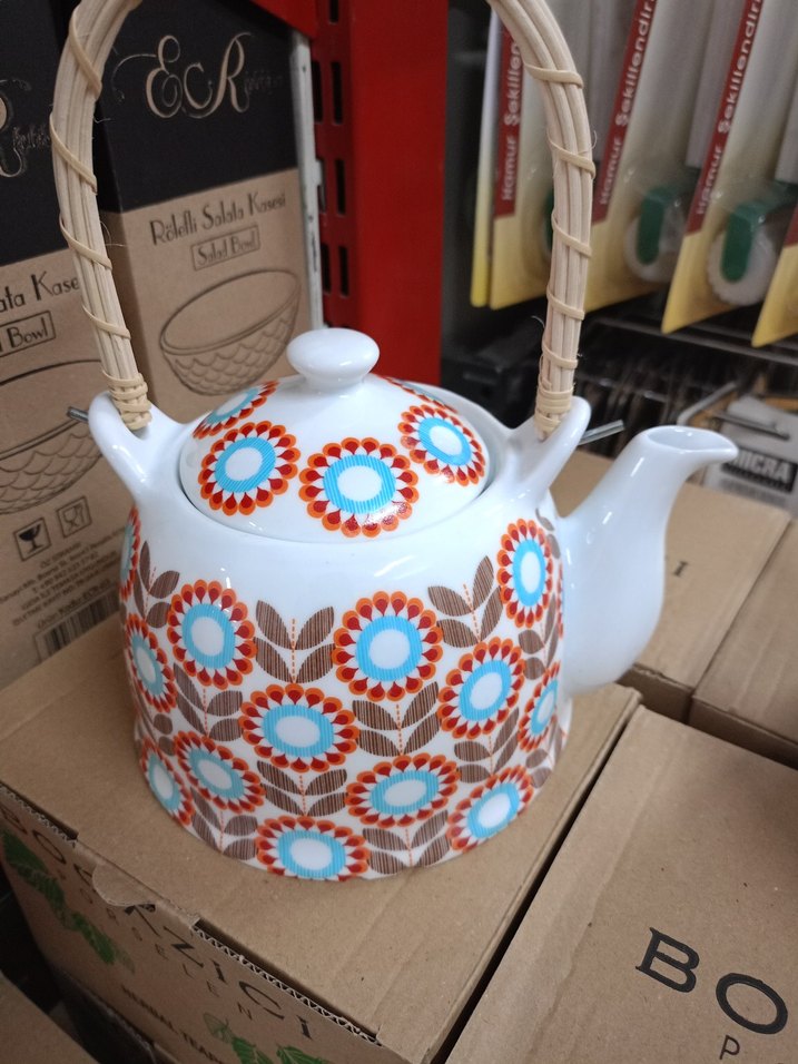Mavi ve kırmızı detaylı renkli çiçek desenine sahip beyaz çaydanlık, örgü sapıyla kullanışlıdır. Üzerinde "B, Kas" yazısı bulunur.