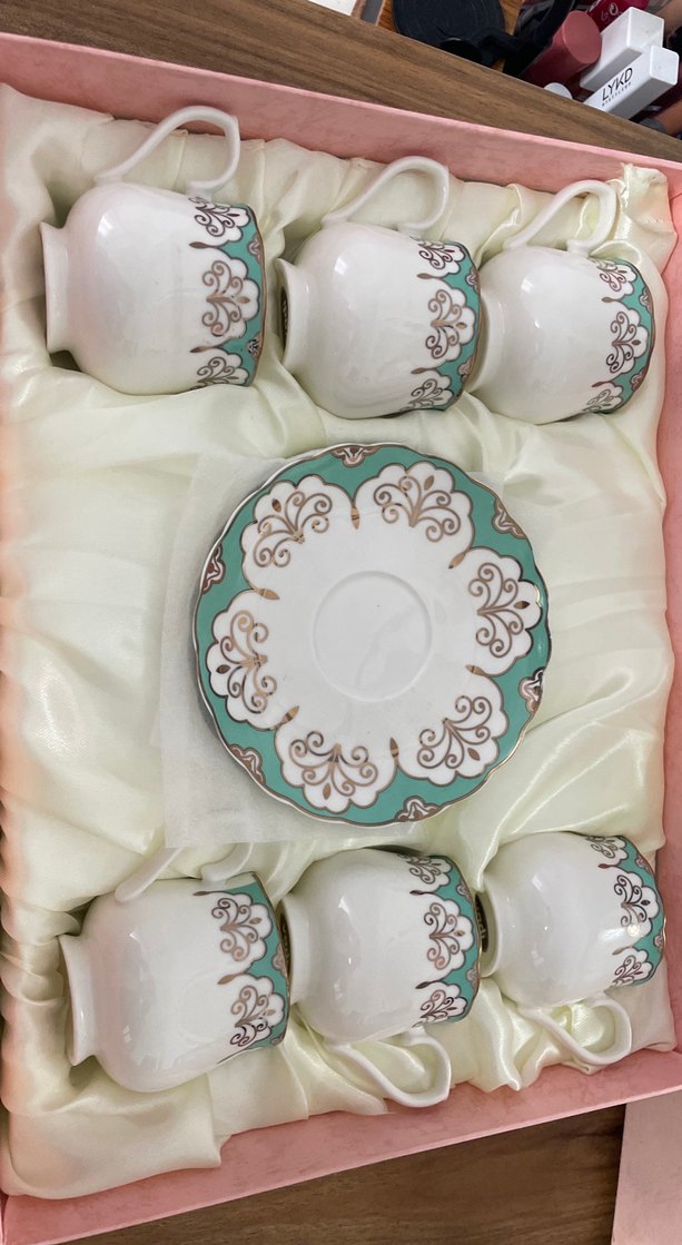 Pastel yeşil desenlerle süslenmiş beyaz porselen fincan ve tabak seti, dalgalı kenar ve küçük kulp ile.