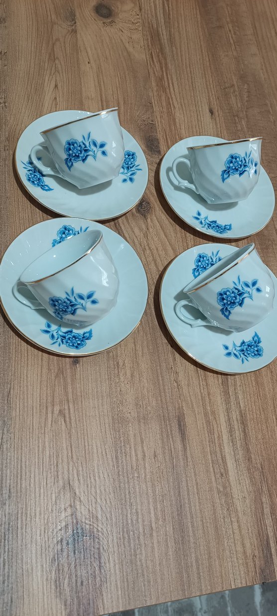 Pastel mavi çiçek desenleri ve altın şeritli porselen fincan takımı.