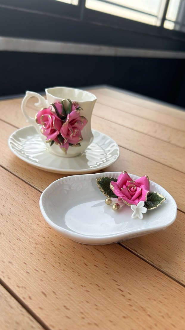 Beyaz porselen fincan veri, üzerinde narin pembe gül detayları bulunur. Fincanın kıvrımlı kulpludur porselen işiyle yapılmıştır tamamen el emeğidir lokumluklar dahil değildir istenirse onlarda eklenebilir