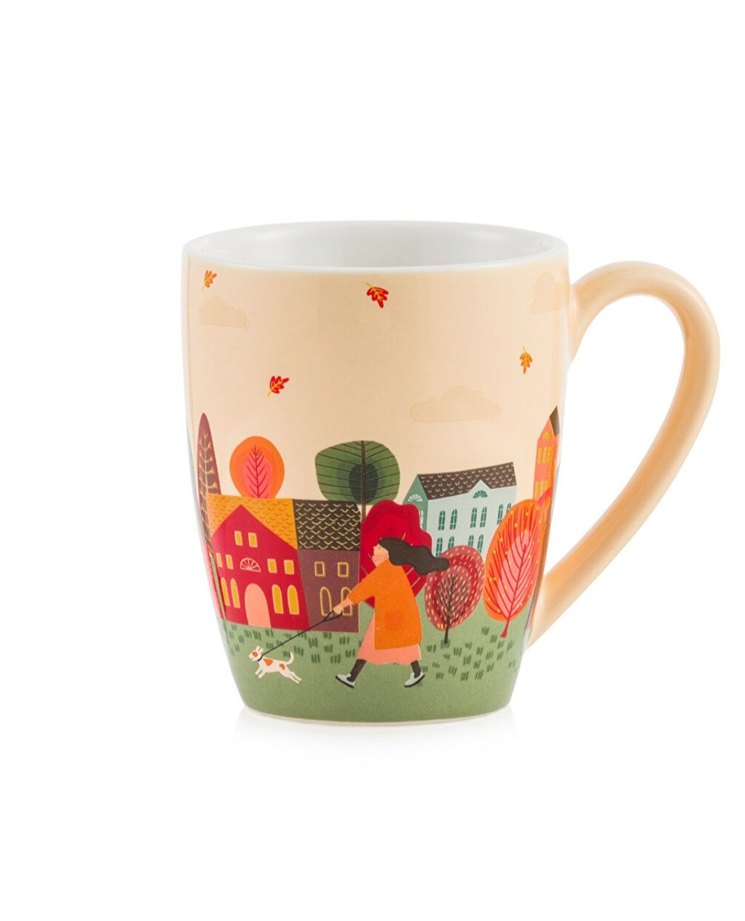 Bej seramik kupada sonbahar temalı, renkli kadın ve köpek yürüyüşü desenleri yer alır. SIFIR KUTULU ÜRÜN.