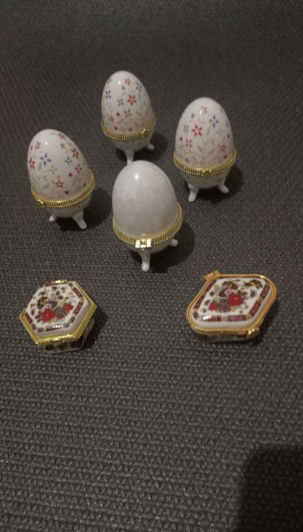 Altın detaylı beyaz dekoratif yumurta ve küçük çiçek desenli kutular, sergileme için uygun. 8.5 cm 3+1 set +2 adet mini çiçek işlemeli porselen kutu
