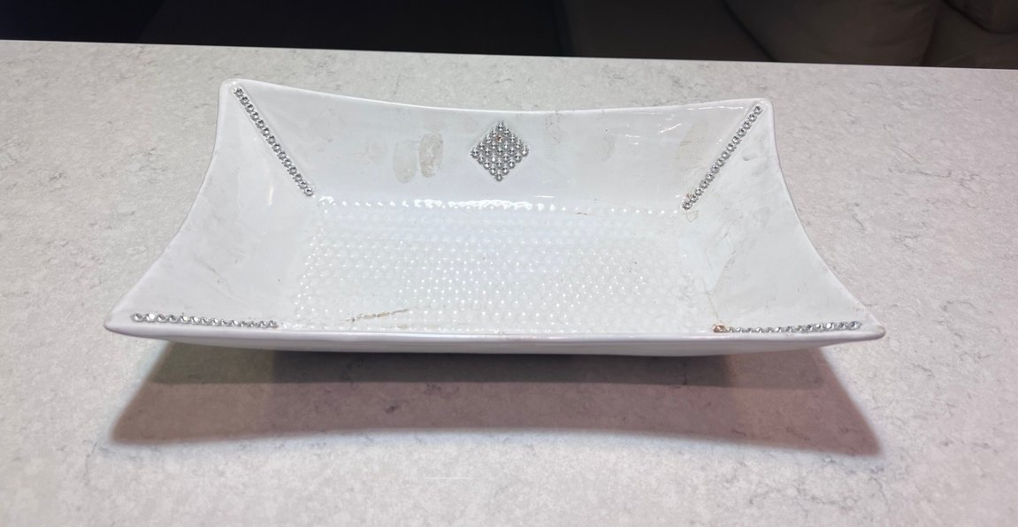 Dekoratif desenli ve parlak beyaz yüzeye sahip yemek kabı. Sunum veya saklama için uygundur. ️