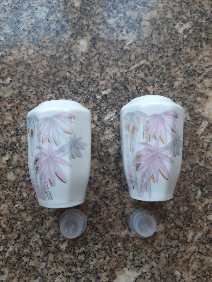 Pembe ve gri çiçek desenlerine sahip beyaz porselen tuzluk /karabiberlik.Ciftinin fiyatıdır.