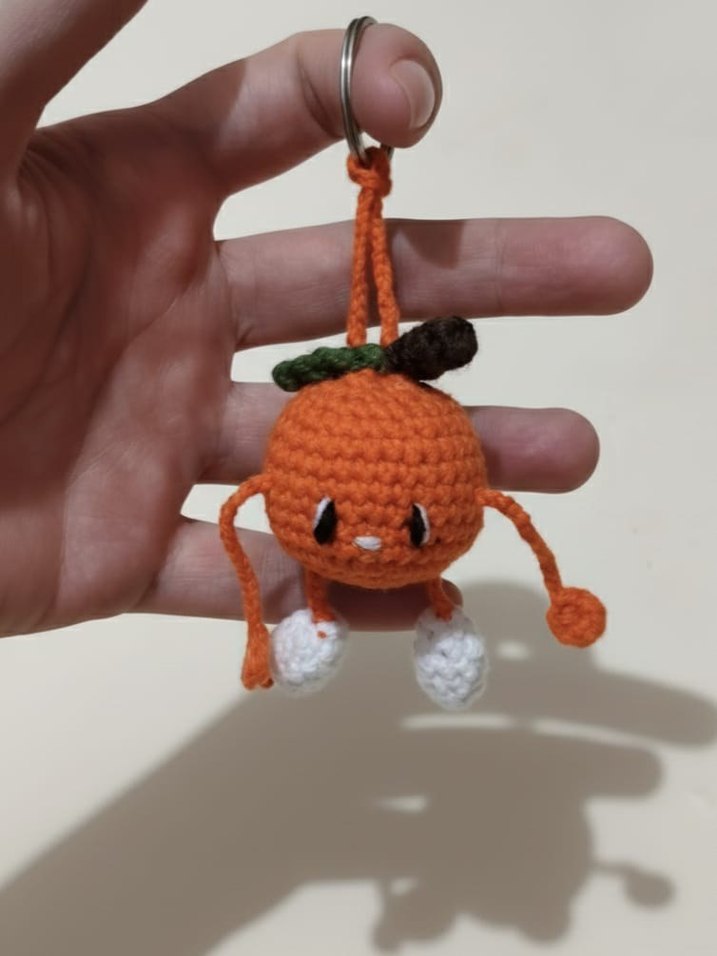Renkli örgü malzemeden yapılmış, turuncu renkli, beyaz ayaklı küçük sevimli figürlü anahtarlık. Minimalist, bohem ve retro tarzlara uygundur.