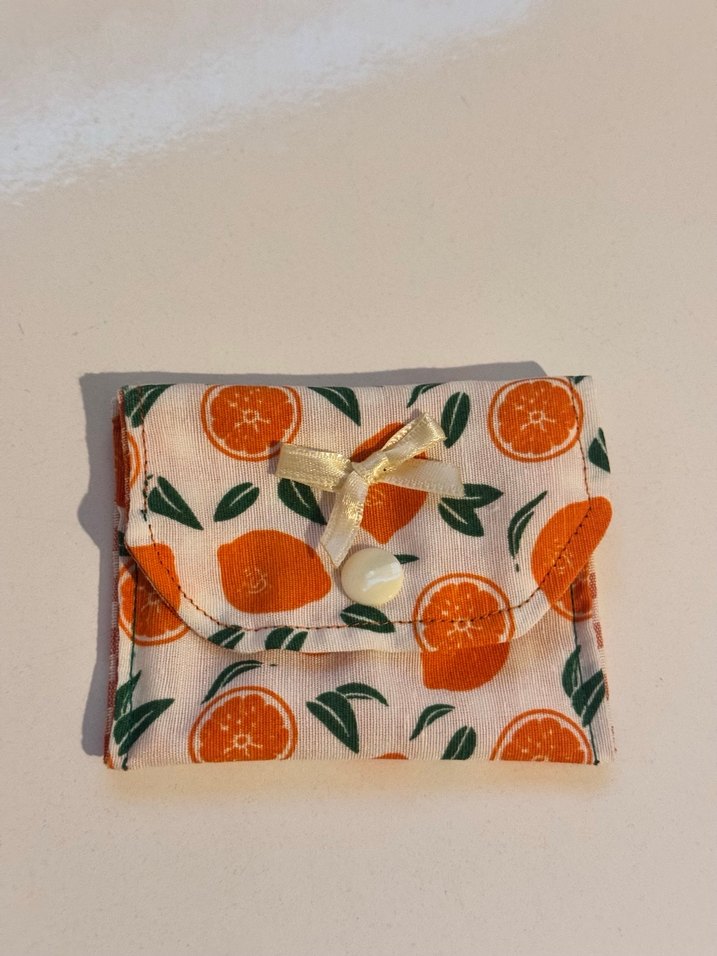 Pastel turuncu baskılı desenli, elastik kapamalı, sentetik kumaştan yapılmış vintage tarzda kadın cüzdanı.