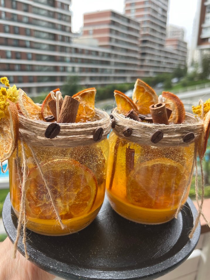 Kurutulmuş portakal dilimleri, tarçın çubukları ve kahve çekirdekleriyle süslenmiş olan mumlar tane fiyatıdır