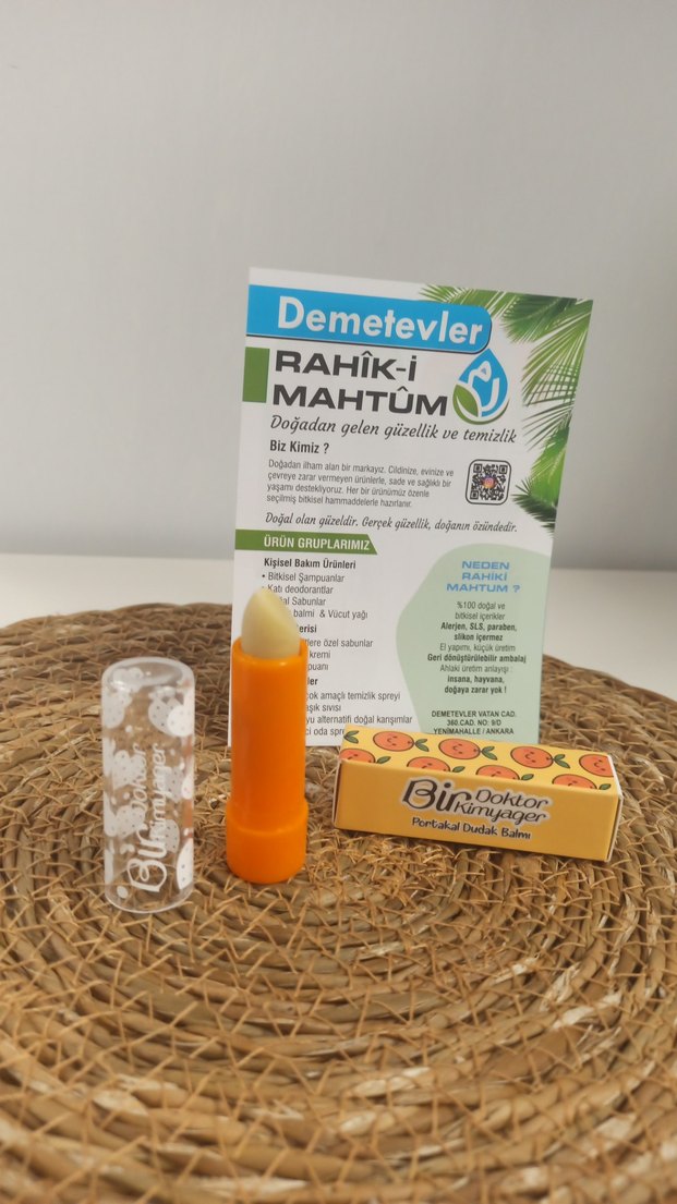 Portakal kokulu, doğal içerikli dudak balmı. Açık turuncu renkli ve şeffaf kapaklıdır.