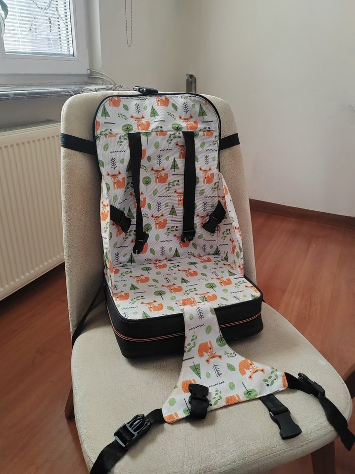 Canlı renklerde hayvan desenli, portatif bebek mama sandalyesi. Siyah güvenlik kayışları ile donatılmış, standart sandalyelere kolayca takılır. Çanta haline getirildiğinde bağlanan kemerin diğer ucu işaretli yerden söküldü. Kolayca dikilebilir ama ben uğraşmadım normalde kullanımına engel değil diye. Heryerde hayat kurtaran bir ürün oldu bizim için.
