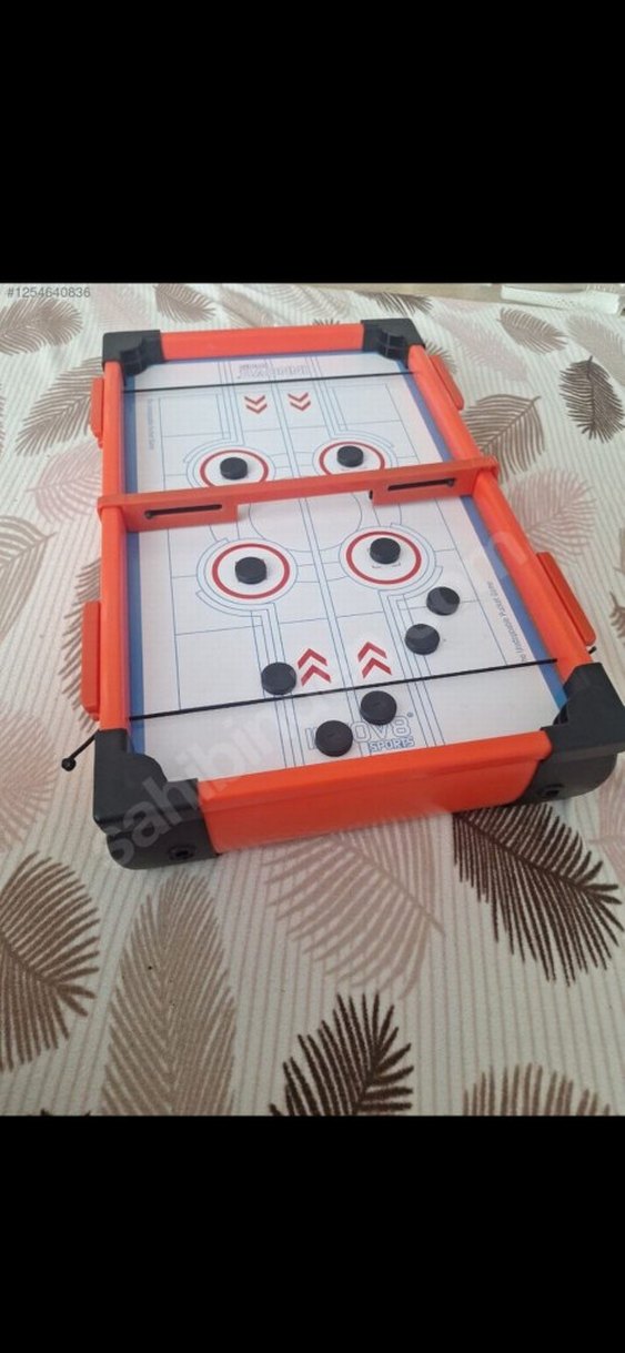 Beyaz oyun yüzeyine ve turuncu çerçeveye sahip portatif mini hava hokeyi oyunu seti. Siyah pucks içerir.