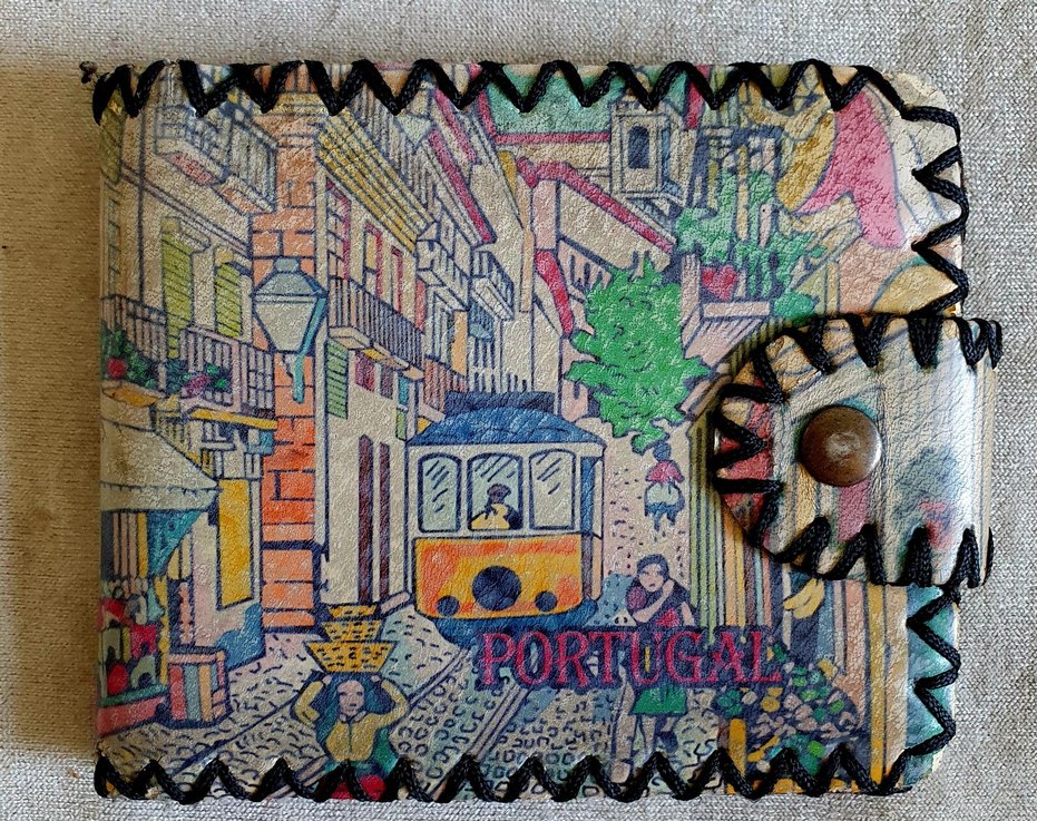 Portekiz sokaklarını ve geleneksel öğeleri renkli çizimlerle anlatan el yapımı deri cüzdan. Kullanılmamıştır ve yepyeni durumda. Kağıt para gözünde gizli fermuarlı bölmesi de mevcut.