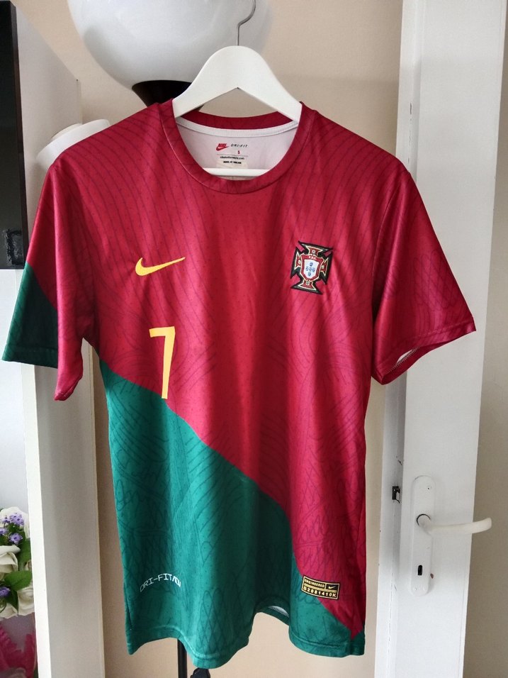 Koyu kırmızı ve yeşil renklerde, baskılı desenli, bisiklet yaka ve kısa kollu Ronaldo forması. Fitted kesim ve velcro detayı bulunur.orijinal değildir.#portekizforması#ronaldo#♂️