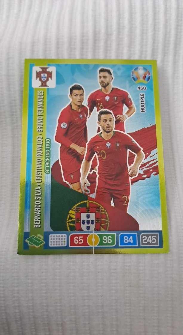 Portekiz futbolcuları Bernardo Silva, Cristiano Ronaldo ve Bruno Fernandes'in yer aldığı, istatistikler ve takım logosu bulunan spor kartı. ⚽